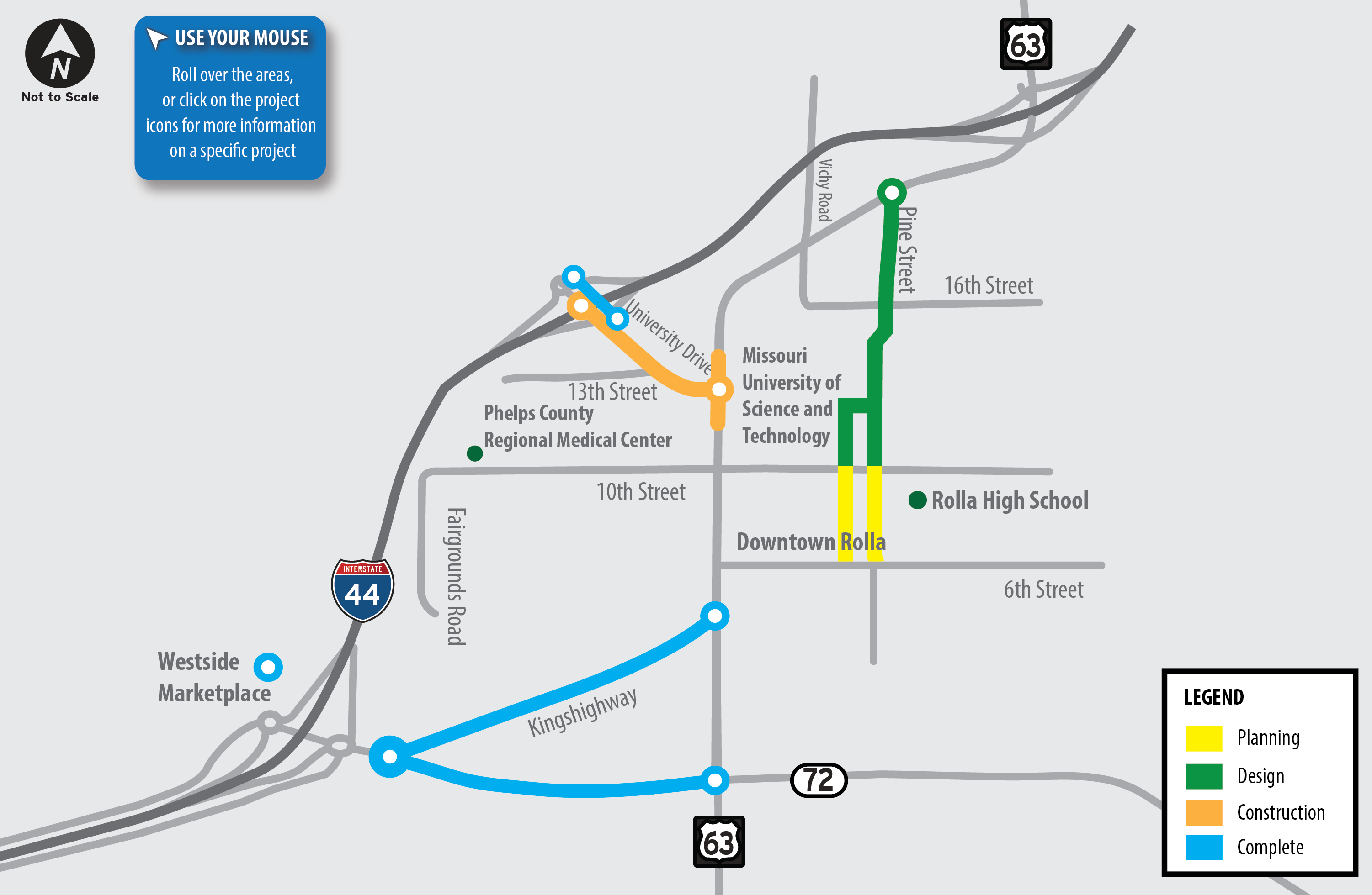 The Move Rolla Transportation Development District (TDD) Program is focused on implementing the projects identified in the Move Rolla Strategy (2015) and presented to voters in the Transportation Development District tax that was approved by district voters in January 2017.  The purpose of the improvements is to develop a transportation system that meets the needs of all people and modes and promotes a safe, healthy community and economic opportunities for the next 20 years.  Goals include: