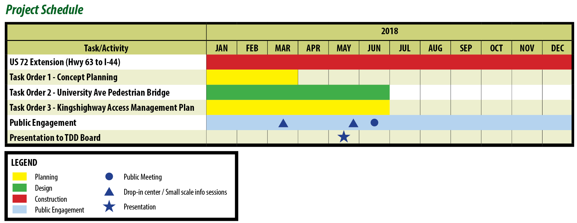 Move Rolla TDD is a five-year program that will include a series of individual projects around the city. Each project will go through planning, design and construction phases. Each project differs in timing. The schedule above is color-coded to help identify what phase each project is in. Symbols highlight when events such a Public Meetings and TDD Board meetings are tentatively scheduled. As projects move forward and additional projects kick off, the schedule will be updated.