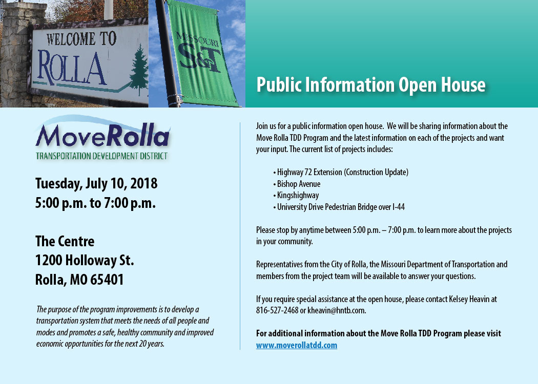 Please stop by anytime between 5:00 p.m. – 7:00 p.m. to learn more about the projects in your community. Representatives from the City of Rolla, the Missouri Department of Transportation and members from the project team will be available to answer your questions.