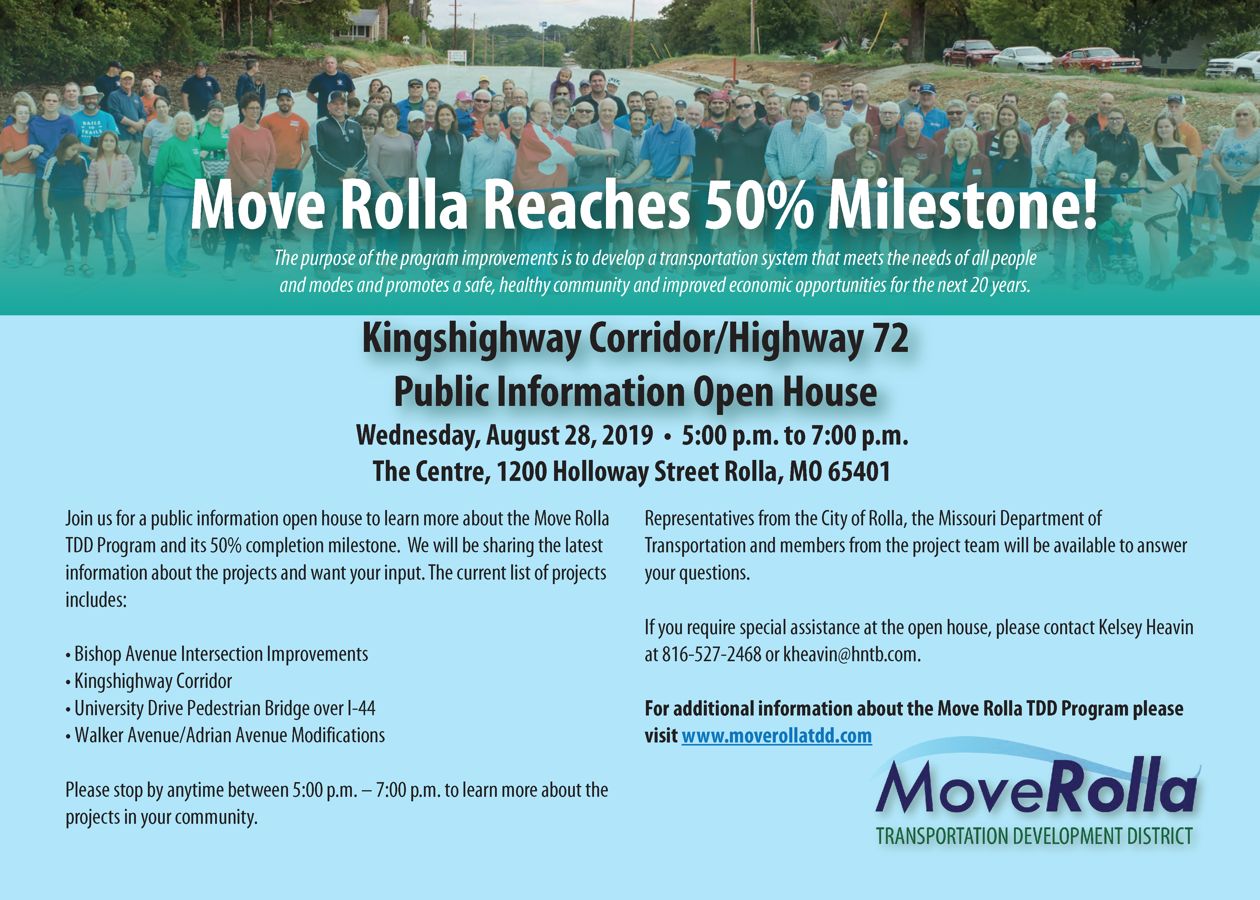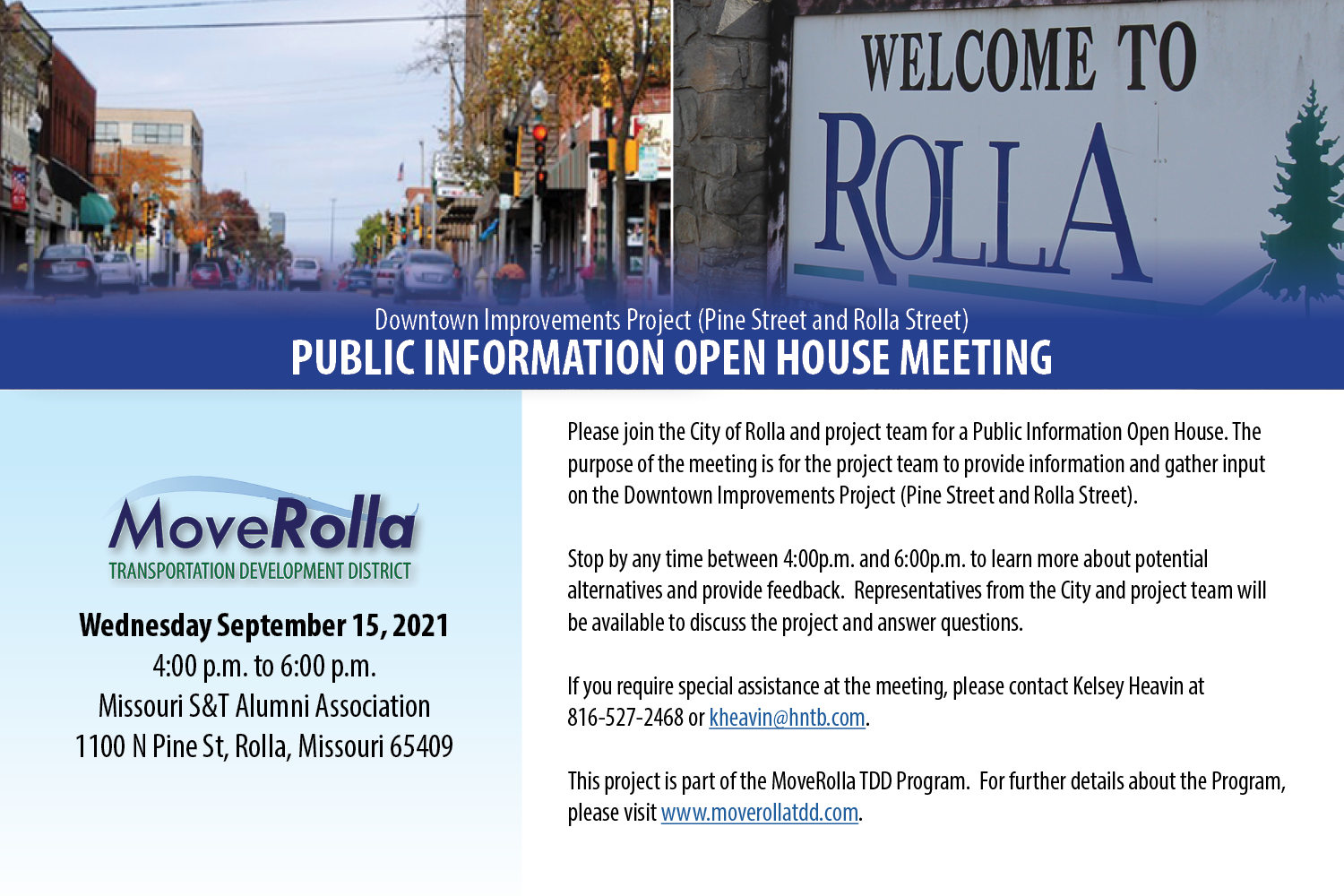 Join us for a public information open house to learn more about the Move Rolla TDD Program and its 50% completion milestone. We will be sharing the latest information about the projects and want your input. The current list of projects includes: