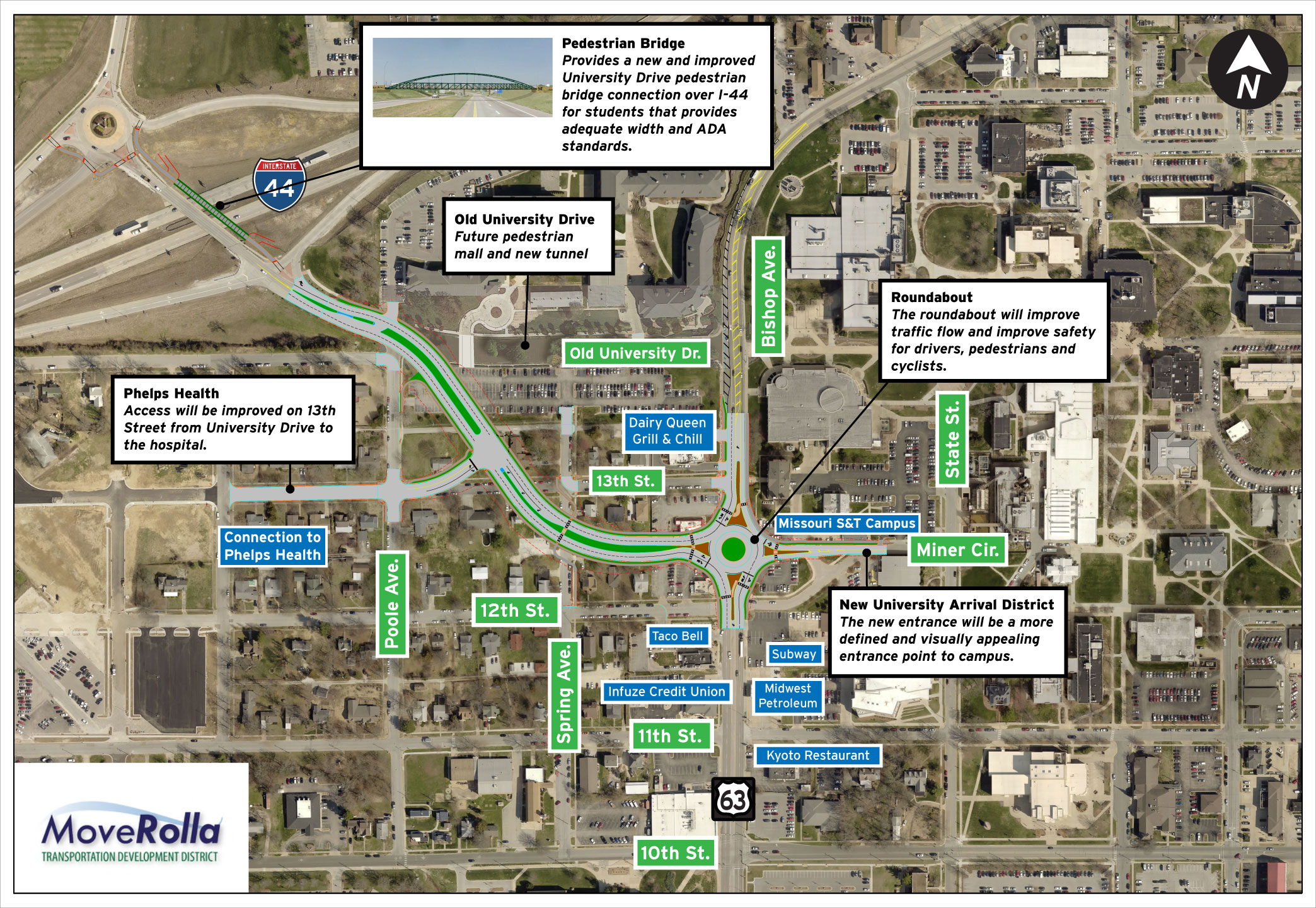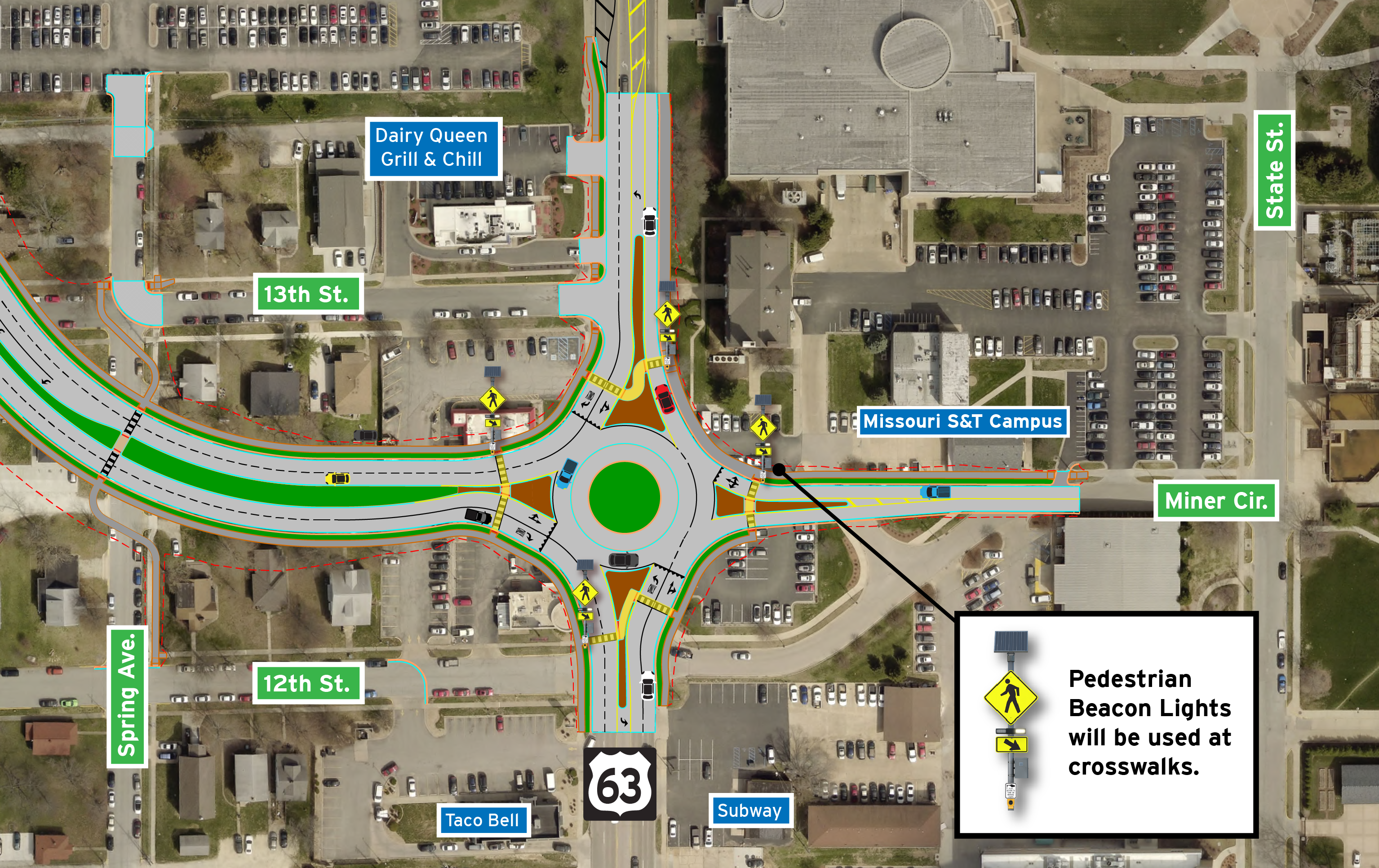 Extensive intersection analysis and coordination with MoDOT and FHWA was undertaken to determine the best intersection type at the relocated University Drive and US 63 intersection. Both a roundabout and traffic signal were determined to provide the necessary safety and traffic operations. The study report and addendum concluded that an intersection with a traffic signal would be recommended due to smaller right of way impacts and lower overall cost when considering both construction and right-of-way. However, the University thought the roundabout better fit with their new master plan and arrival district. As a result, the University provided the funds for the additional cost of the roundabout. After the cost difference to the TDD between the two intersections was equalized with the funds provided by the University the entire Move Rolla TDD Board approved the roundabout. This intersection type best met the goals of the Move Rolla TDD program, City and the University of providing an intersection that improved both pedestrian and vehicular safety as well as traffic flow.
